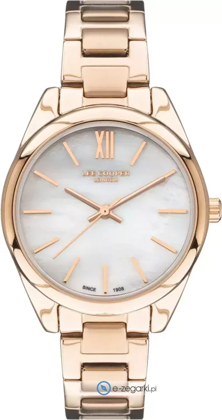 Zegarek damski LC07450.420 marki Lee Cooper to dobra propozycja dla ludzi ceniących sobie dbałość o detale jak również bezproblemowe funkcjonowanie mechanizmów. Cyferblat zegarka jest w kolorze białym. Godzina prezentowana jest w sposób analogowy co niezmiernie łatwo pozwala ją odczytać. Koperta w barwach koloru różowo złotego szeroka jest na 35 mm - posiada okrągły kształt.