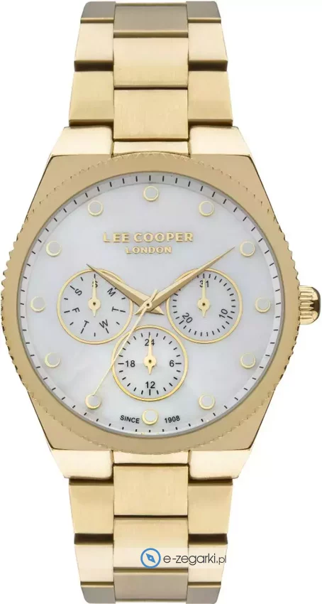 Zegarek damski LC07452.120 marki Lee Cooper to idealne połączenie funkcjonalności a także ciekawego wzornictwa. Nieschematyczny wygląd zegarka osiągnięto m.in. poprzez tarczę w kolorze białym. Godzina prezentowana jest w sposób analogowy co niezmiernie łatwo pozwala ją odczytać. Koperta jest pokryta kolorem złotym szeroka jest na 38 mm - posiada okrągły kształt.