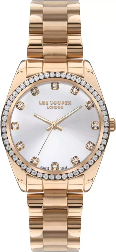 Zegarek damski LC07478.430 marki Lee Cooper to idealna propozycja dla ludzi ceniących sobie dbałość o szczegóły oraz bezawaryjne działanie mechanizmów. Wysokiej trwałości tarczę zegarka ozdobiono srebrnym kolorem. Aktualna godzina przedstawiona jest w sposób analogowy co niezmiernie łatwo pozwala ją odczytać. Koperta jest ozdobiona kolorem różowo złotym szeroka jest na 34 mm - w kształcie okrągłym.