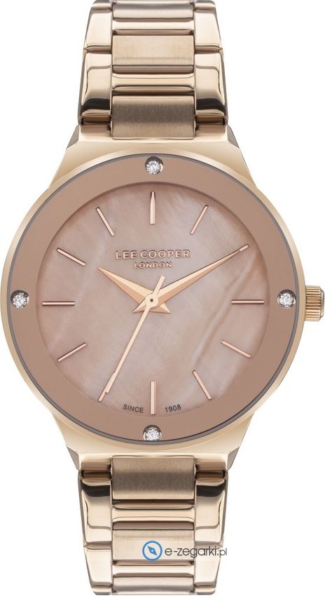 Damski zegarek Lee Cooper LC07480.420 to zegarek, który dzięki swemu wzornictwu zawsze będzie prezentował się dobrze. Charakteru nadaje wysokiej klasy cyferblat w kolorze różowo złotym. Aktualna godzina zaprezentowana jest w sposób analogowy co niezmiernie łatwo pozwala ją odczytać. Koperta jest w kolorze różowo złotym szeroka jest na 35 mm - w kształcie okrągłym.