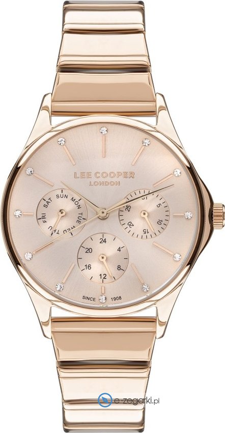 Model LC07482.410 marki Lee Cooper to gustowny zegarek naręczny damski, który wyposażono w ciekawe rozwiązania i funkcje. Tarcza zegarka jest w kolorze różowo złotym. Aktualna godzina pokazywana jest w sposób analogowy co intuicyjnie pozwala ją odczytać. Koperta jest ozdobiona kolorem różowo złotym szeroka jest na 36 mm - posiada okrągły kształt.
