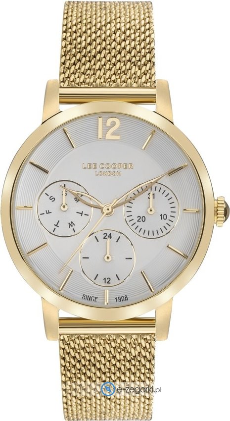 Model LC07552.130 marki Lee Cooper to gustowny zegarek naręczny damski, który posiada pomysłowe rozwiązania i funkcje. Tarcza zegarka jest w kolorze srebrnym. Zegarek ten prezentuje aktualny czas w formacie analogowym dzięki czemu odczyt jest bezproblemowy. Koperta jest w kolorze złotym szeroka jest na 36 mm - wyróżnia się okrągłym kształtem.