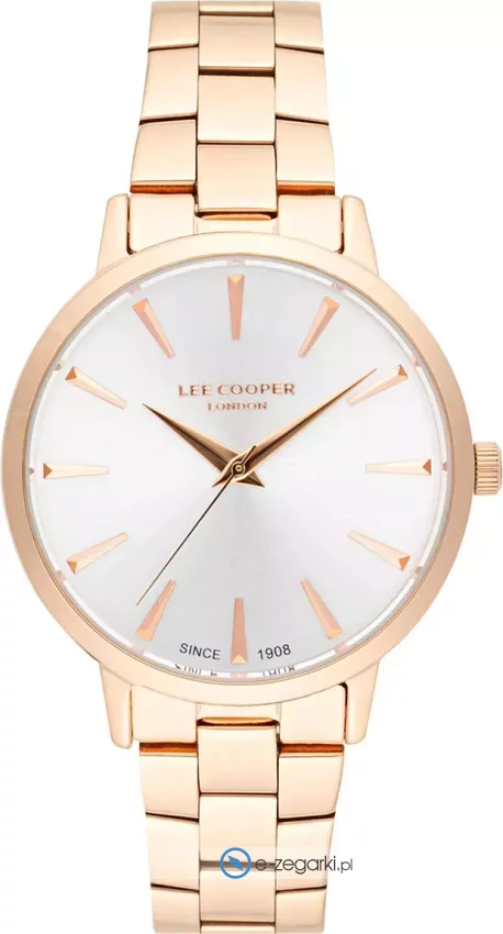Zegarek damski LC07580.430 marki Lee Cooper to stylowe połączenie funkcjonalności a także modnego wzornictwa. Cyferblat zegarka jest w kolorze srebrnym. Zegarek ten prezentuje aktualny czas w formacie analogowym dzięki temu odczyt jest bezproblemowy. Koperta jest w kolorze różowo złotym szeroka jest na 35 mm - w kształcie okrągłym.