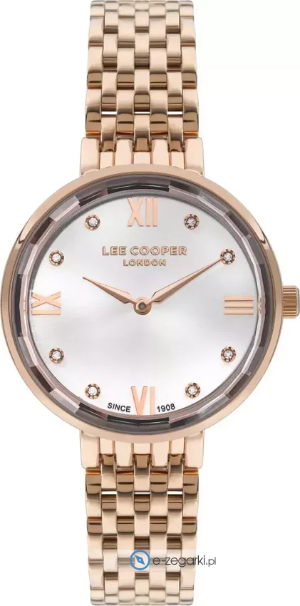 Zegarek damski LC07610.430 marki Lee Cooper to idealne połączenie funkcjonalności a także modnego designu. Charakterystyczną stylistykę czasomierza uzyskano dzięki tarczy w kolorze srebrnym. Aktualna godzina prezentowana jest w sposób analogowy co intuicyjnie pozwala ją odczytać. Koperta jest pokryta kolorem różowo złotym szeroka jest na 34 mm - cechuje się okrągłym kształtem.