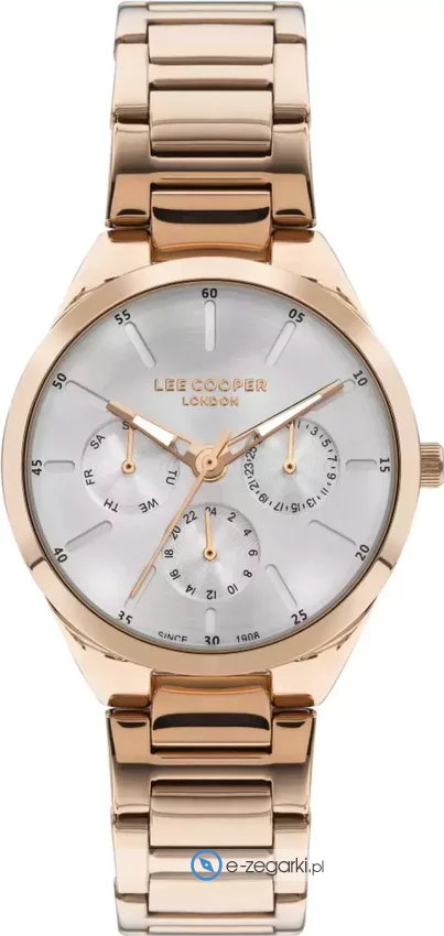 Zegarek damski LC07643.430 marki Lee Cooper to idealne połączenie funkcjonalności oraz ciekawego wzornictwa. Atrakcyjny wygląd zegarka uzyskano również dzięki tarczy w kolorze srebrnym. Aktualna godzina zaprezentowana jest w sposób analogowy co intuicyjnie pozwala ją odczytać. Koperta w odcieniach koloru różowo złotego szeroka jest na 36 mm - ma okrągły kształt.