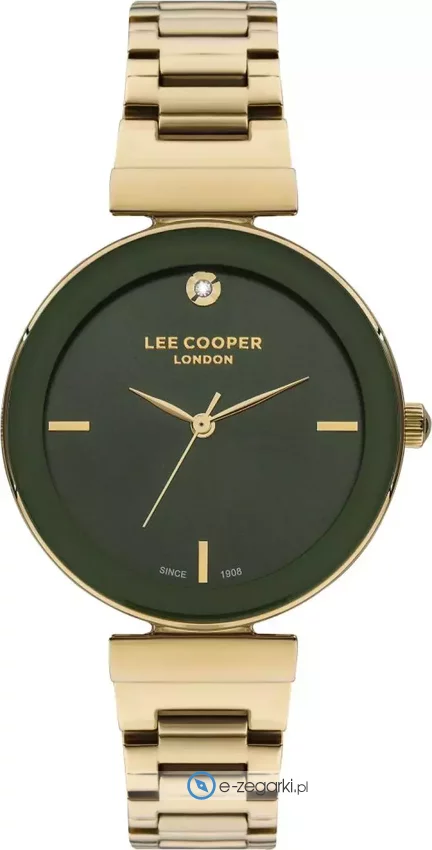Model LC07711.270 marki Lee Cooper to elegancki zegarek naręczny damski, który jest wyposażony w pomysłowe rozwiązania i funkcje. Wysokiej jakości cyferblat zegarka ozdobiono zielonym kolorem. Godzina pokazywana jest w sposób analogowy co bez trudu pozwala ją odczytać. Koperta w barwach koloru złotego szeroka jest na 35 mm - cechuje się okrągłym kształtem.