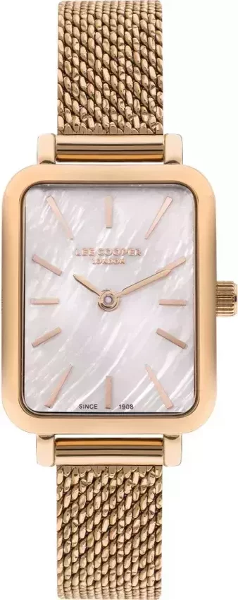 Damski zegarek Lee Cooper LC07815.420 to zegarek, który dzięki swemu wzornictwu zawsze będzie prezentował się dobrze. Stylu dodaje wysokiej jakości cyferblat w kolorze perłowym. Godzina przedstawiona jest w sposób analogowy co intuicyjnie pozwala ją odczytać. Koperta jest pokryta kolorem różowo złotym szeroka jest na 21 mm - posiada prostokątny kształt.