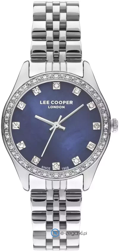 Damski zegarek Lee Cooper LC07818.390 to zegarek, który dzięki swemu wzornictwu zawsze będzie prezentował się dobrze. Wysokiej trwałości cyferblat zegarka ozdobiono granatowym kolorem. Zegarek ten pokazuje aktualny czas w formacie analogowym dzięki temu odczyt jest bezproblemowy. Koperta jest w kolorze srebrnym szeroka jest na 33 mm - w kształcie okrągłym.