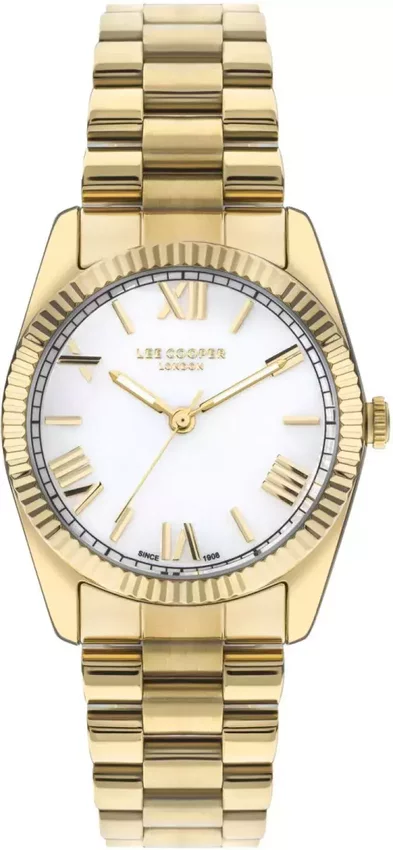 Model LC07825.120 marki Lee Cooper to elegancki zegarek naręczny damski, który wyposażono w pomysłowe rozwiązania i funkcje. Nieschematyczny wygląd zegarka uzyskano m.in. poprzez cyferblat w kolorze białym. Zaprezentowana metodą analogową aktualna godzina jest czytelna i prosta do sprawdzenia. Koperta jest w kolorze złotym szeroka jest na 36 mm - posiada okrągły kształt.