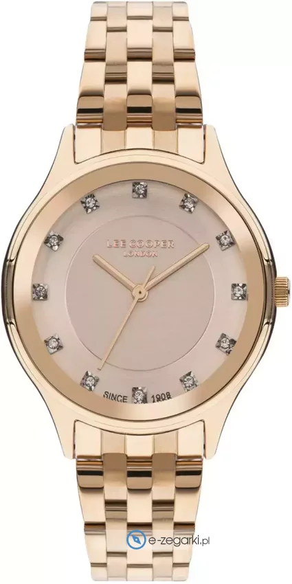 Damski zegarek Lee Cooper LC07867.410 to zegarek, który dzięki swemu wzornictwu zawsze będzie prezentował się dobrze. Cyferblat zegarka jest w kolorze różowo złotym. Zegarek ten pokazuje godzinę w formacie analogowym dzięki temu odczyt jest bardzo łatwy. Koperta jest w kolorze różowo złotym szeroka jest na 35 mm - w kształcie okrągłym.