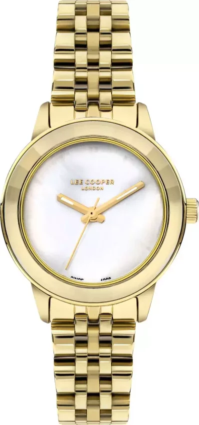 Damski zegarek Lee Cooper LC07934.120 to zegarek, który dzięki swemu wzornictwu zawsze będzie prezentował się dobrze. Cyferblat zegarka jest w kolorze białym. Zaprezentowana metodą analogową aktualna godzina jest czytelna i szybka do odczytania. Koperta jest w kolorze złotym szeroka jest na 30 mm - wyróżnia się okrągłym kształtem.
