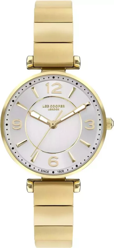 Zegarek damski LC07935.130 marki Lee Cooper to idealna propozycja dla osób ceniących sobie dbałość o szczegóły a także bezproblemowe działanie mechanizmów. Niestereotypowy wygląd czasomierza uzyskano m.in. poprzez cyferblat w kolorze srebrnym. Aktualna godzina przedstawiona jest w sposób analogowy co bez trudu pozwala ją odczytać. Koperta jest w kolorze złotym szeroka jest na 31 mm - w kształcie okrągłym.