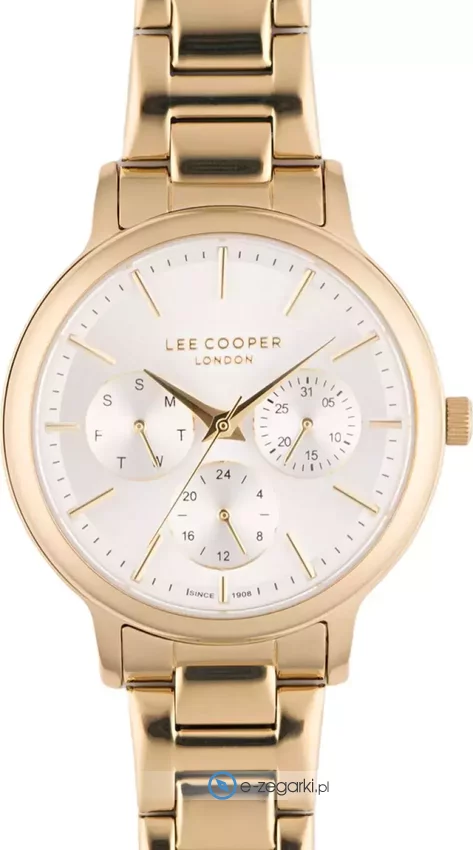 Model LC07946.130 marki Lee Cooper to stylowy zegarek naręczny damski, który posiada ciekawe rozwiązania i funkcje. Charakter zapewnia wysokiej klasy cyferblat w kolorze srebrnym. Zaprezentowana metodą analogową bieżąca godzina jest czytelna i prosta do sprawdzenia. Koperta jest pokryta kolorem złotym szeroka jest na 35 mm - ma okrągły kształt.