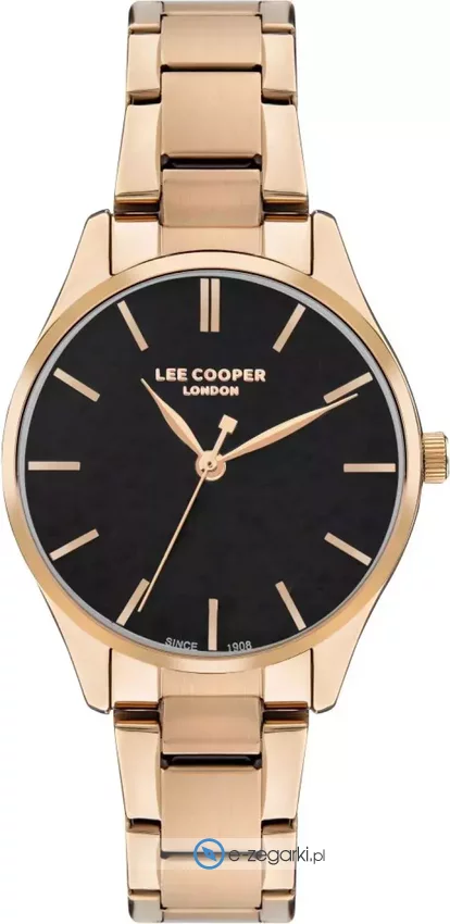 Zegarek damski LC07958.450 marki Lee Cooper to idealne połączenie funkcjonalności a także modnego designu. Cyferblat zegarka jest w kolorze czarnym. Godzina pokazywana jest w sposób analogowy co bez trudu pozwala ją odczytać. Koperta została ozdobiona kolorem różowo złotym szeroka jest na 34 mm - ma okrągły kształt.