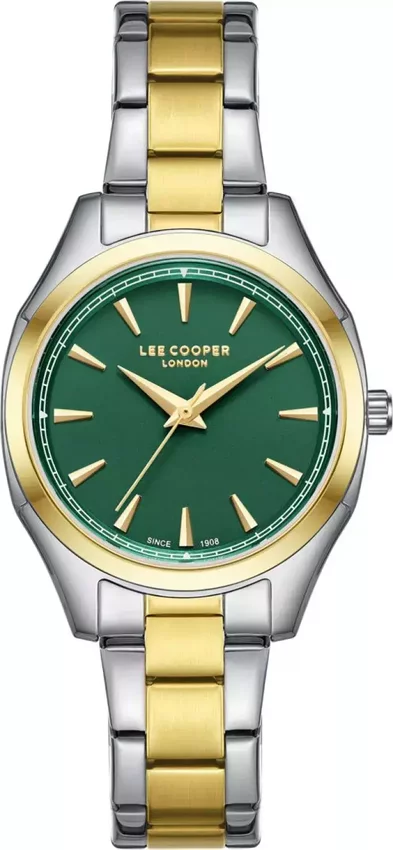 Zegarek damski LC08006.270 marki Lee Cooper to idealne połączenie funkcjonalności a także modnego designu. Charakter zapewnia wysokiej jakości tarcza w kolorze zielonym. Zegarek ten prezentuje godzinę w formacie analogowym dzięki czemu odczyt jest bardzo łatwy. Koperta jest w kolorze srebrno złotym szeroka jest na 31 mm - ma okrągły kształt.
