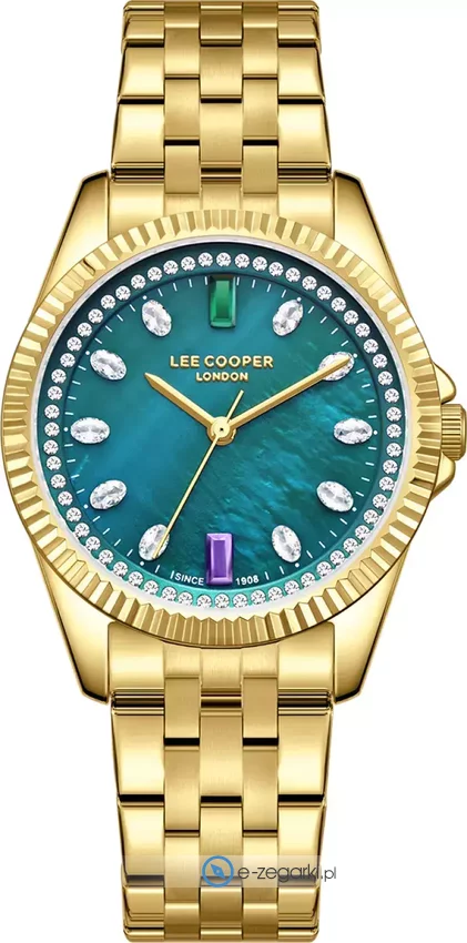 Zegarek damski LC08033.170 marki Lee Cooper to stylowe połączenie funkcjonalności i modnego designu. Stylu dodaje wysokiej jakości cyferblat w kolorze zielonym. Zegarek ten prezentuje aktualny czas w formacie analogowym dzięki czemu odczyt jest bardzo łatwy. Koperta jest w kolorze złotym szeroka jest na 35 mm - ma okrągły kształt.
