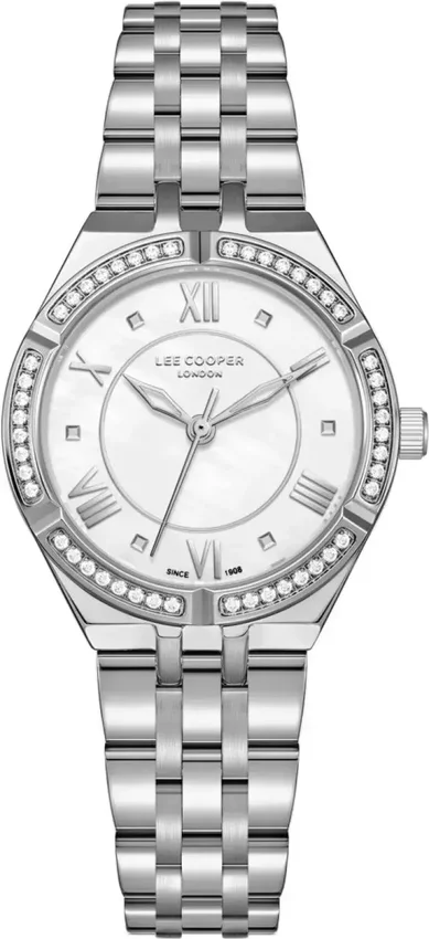 Model LC08132.320 marki Lee Cooper to stylowy zegarek naręczny damski, który posiada ciekawe rozwiązania i funkcje. Styl zapewnia wysokiej jakości cyferblat w kolorze perłowym. Zaprezentowana metodą analogową aktualna godzina jest czytelna i prosta do odczytania. Koperta jest w kolorze srebrnym szeroka jest na 30 mm - ma okrągły kształt.