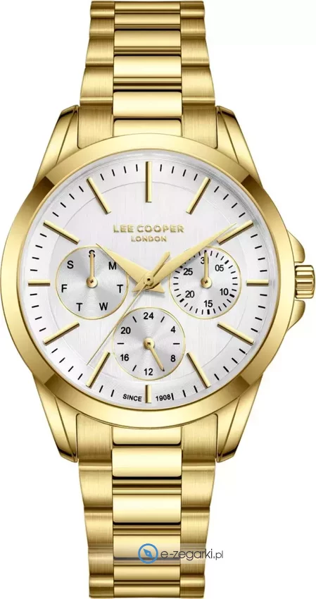 Zegarek damski LC08141.130 marki Lee Cooper to idealna pozycja dla ludzi ceniących sobie dbałość o detale a także sprawne funkcjonowanie mechanizmów. Charakteru dodaje wysokiej jakości cyferblat w kolorze srebrnym. Godzina zaprezentowana jest w sposób analogowy co bez trudu pozwala ją odczytać. Koperta w odcieniach koloru złotego szeroka jest na 34 mm - w kształcie okrągłym.