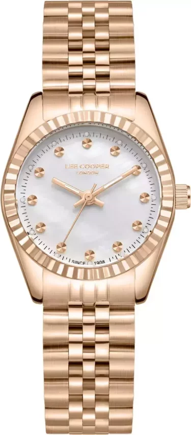 Model LC08167.420 marki Lee Cooper to elegancki zegarek naręczny damski, który jest wyposażony w pomysłowe rozwiązania i funkcje. Nieschematyczny wygląd czasomierza uzyskano również dzięki tarczy w kolorze perłowym. Zaprezentowana metodą analogową aktualna godzina jest czytelna i łatwa do odczytania. Koperta jest ozdobiona kolorem różowo złotym szeroka jest na 28 mm - w kształcie okrągłym.