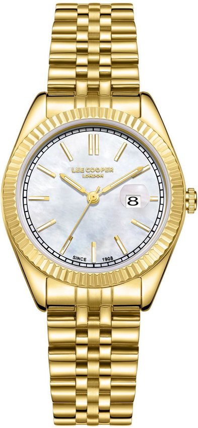 Model LC08210.120 marki Lee Cooper to elegancki zegarek naręczny damski, który posiada pomysłowe rozwiązania i funkcje. Styl zapewnia wysokiej jakości tarcza w kolorze perłowym. Aktualna godzina przedstawiona jest w sposób analogowy co intuicyjnie pozwala ją odczytać. Koperta w odcieniach koloru złotego szeroka jest na 32 mm - posiada okrągły kształt.