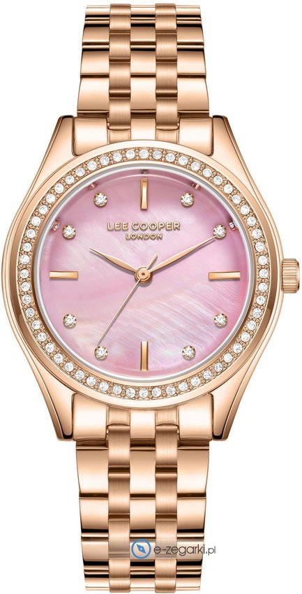 Zegarek damski LC08211.480 marki Lee Cooper to ciekawa propozycja dla osób ceniących sobie dbałość o szczegóły a także bezproblemowe działanie mechanizmów. Charakteru nadaje wysokiej klasy cyferblat w kolorze różowym. Zaprezentowana metodą analogową bieżąca godzina jest czytelna i łatwa do odczytania. Koperta została ozdobiona kolorem różowo złotym szeroka jest na 33 mm - cechuje się okrągłym kształtem.