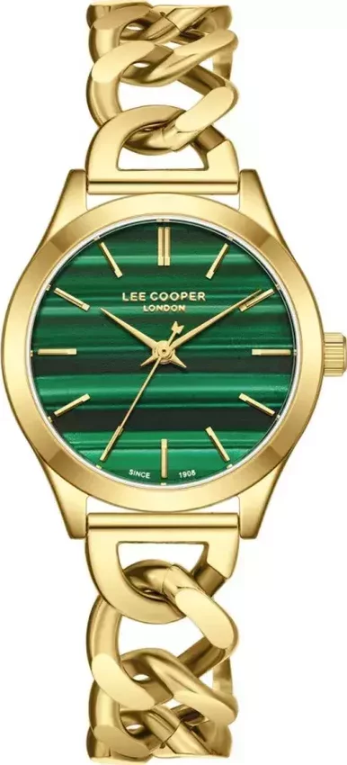 Damski zegarek Lee Cooper LC08291.170 to kwintesencja brytyjskiego stylu i modowego charakteru. Ten wyjątkowy czasomierz, dzięki swojemu unikalnemu wzornictwu, zawsze będzie prezentował się doskonale na nadgarstku. Charakterystyczna konstrukcja tego zegarka osiągnięto dzięki zastosowaniu tarczy w odcieniach zieleni, która przyciąga wzrok i dodaje elegancji. Zegarek ten wyświetla godzinę w formacie analogowym, co sprawia, że odczyt jest niezwykle intuicyjny. Koperta w kolorze złotym o szerokości 30 mm charakteryzuje się okrągłym kształtem, idealnie komponując się z całością.