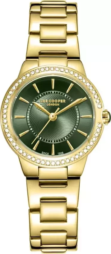Model LC08295.170 marki Lee Cooper to stylowy zegarek naręczny damski, który jest wyposażony w pomysłowe rozwiązania oraz funkcje. Cyferblat zegarka jest w kolorze zielonym. Pokazana metodą analogową bieżąca godzina jest czytelna i szybka do odczytania. Koperta jest w kolorze złotym szeroka jest na 30 mm - wyróżnia się okrągłym kształtem.