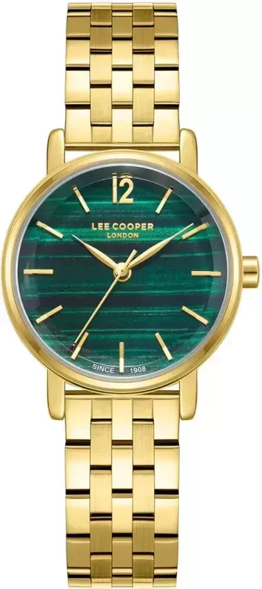 Damski zegarek Lee Cooper LC08297.170 to zegarek, który dzięki swemu wzornictwu zawsze będzie prezentował się dobrze. Wysokiej jakości tarczę zegarka pokryto zielonym kolorem. Zaprezentowana metodą analogową aktualna godzina jest czytelna i prosta do sprawdzenia. Koperta jest w kolorze złotym szeroka jest na 30 mm - w kształcie okrągłym.