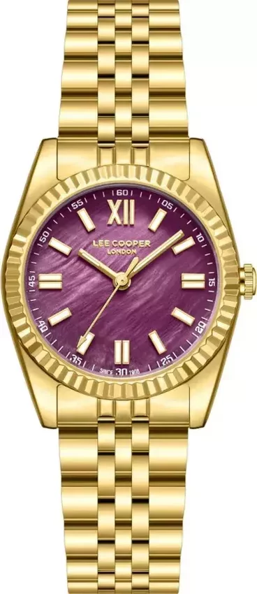 Damski zegarek Lee Cooper LC08303.180 to zegarek, który dzięki swemu wzornictwu zawsze będzie prezentował się dobrze. Styl zapewnia wysokiej klasy cyferblat w kolorze fioletowym. Godzina pokazywana jest w sposób analogowy co bez trudu pozwala ją odczytać. Koperta jest w kolorze złotym szeroka jest na 30 mm - posiada okrągły kształt.