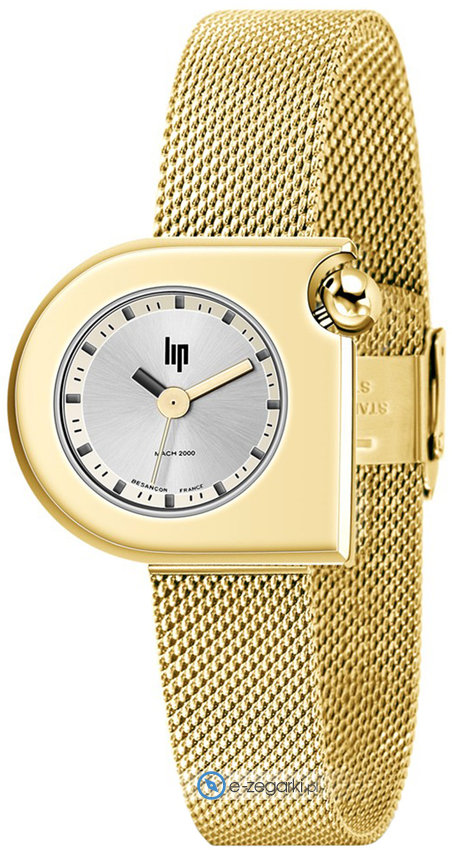 Model 671168 marki Lip to stylowy zegarek naręczny damski, który posiada ciekawe rozwiązania i funkcje. Styl zapewnia wysokiej klasy cyferblat w kolorze srebrnym. Aktualna godzina prezentowana jest w sposób analogowy co niezmiernie łatwo pozwala ją odczytać. Koperta jest w kolorze złotym szeroka jest na 30 mm.