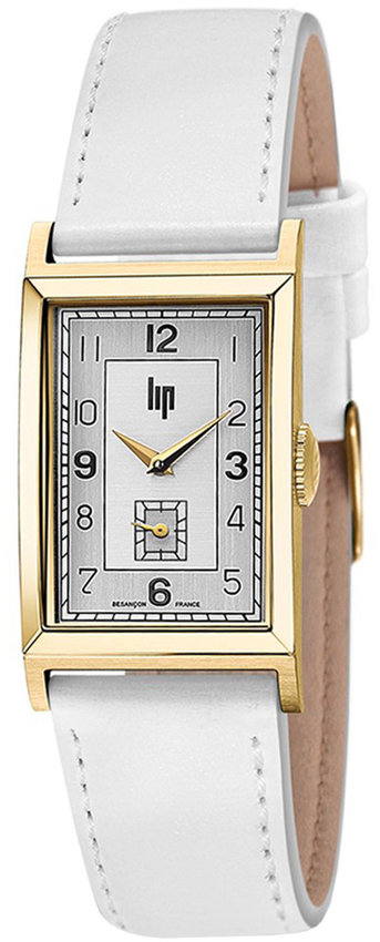 Model 671441 marki Lip to gustowny zegarek naręczny damski, który jest wyposażony w ciekawe rozwiązania oraz funkcje. Tarcza zegarka jest w kolorze srebrnym. Zaprezentowana metodą analogową aktualna godzina jest czytelna i prosta do odczytania. Koperta jest w kolorze złotym szeroka jest na 21 mm oraz ma grubość 8 mm - ma prostokątny kształt.