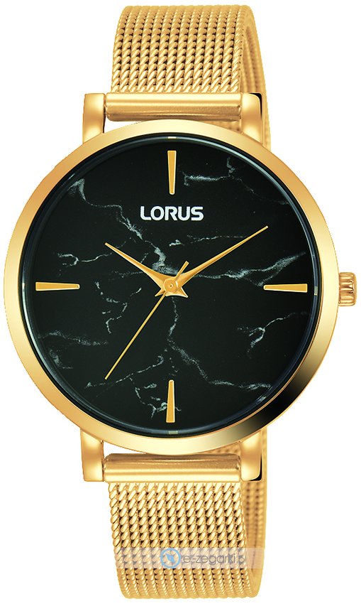 Model RG260SX9 marki Lorus to elegancki zegarek naręczny damski, który wyposażono w ciekawe rozwiązania i funkcje. Cyferblat zegarka jest w kolorze czarnym. Aktualna godzina przedstawiona jest w sposób analogowy co bez trudu pozwala ją odczytać. Koperta w odcieniach koloru złotego szeroka jest na 34 mm oraz ma grubość 8 mm - ma okrągły kształt.