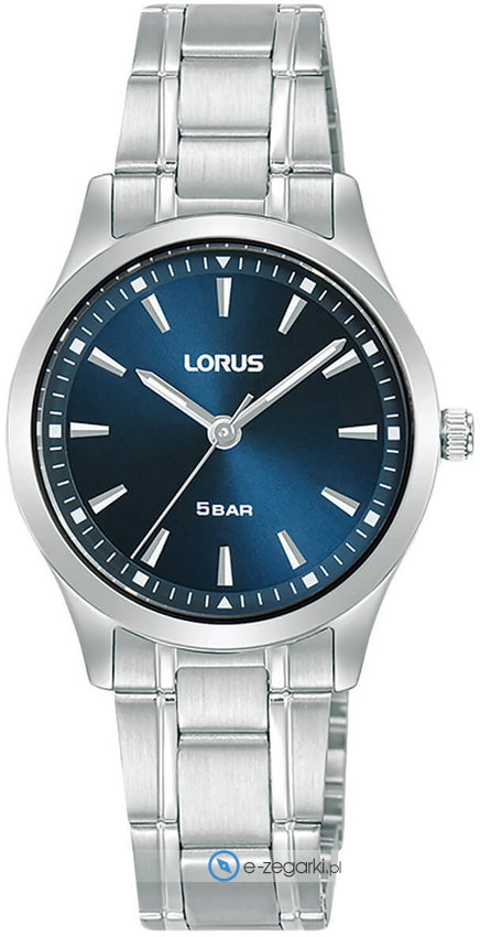 Zegarek damski RRX29JX9 marki Lorus to ciekawa propozycja dla ludzi ceniących sobie dbałość o szczegóły a także sprawne działanie mechanizmów. Ciekawą konstrukcję zegarka uzyskano dzięki tarczy w kolorze niebieskim. Godzina zaprezentowana jest w sposób analogowy co bez trudu pozwala ją odczytać. Koperta w barwach koloru srebrnego szeroka jest na 28 mm oraz ma grubość 7 mm - w kształcie okrągłym.