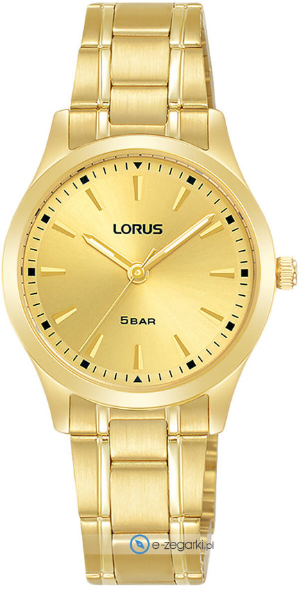 Model RRX34JX9 marki Lorus to stylowy zegarek naręczny damski, który jest wyposażony w ciekawe rozwiązania i funkcje. Tarcza zegarka jest w kolorze złotym. Zegarek ten prezentuje aktualny czas w formacie analogowym dzięki temu odczyt jest intuicyjny. Koperta jest w kolorze złotym szeroka jest na 28 mm oraz ma grubość 7 mm - charakteryzuje się okrągłym kształtem.