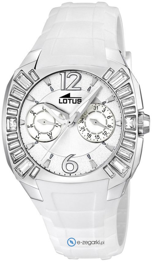 Model L15751-1 marki Lotus to stylowy zegarek naręczny damski, który posiada ciekawe rozwiązania oraz funkcje. Cyferblat zegarka w kolorze białym. Pokazana metodą analogową aktualna godzina jest czytelna i łatwa do odczytania.