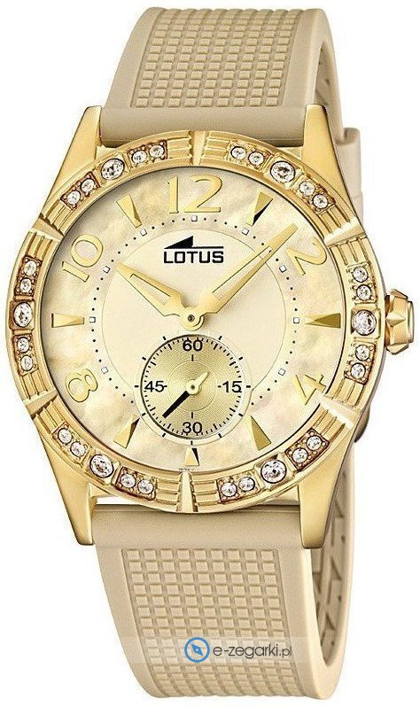 Zegarek damski L15762-2 marki Lotus to dobre połączenie funkcjonalności a także ciekawego wzornictwa. Wysokiej trwałości cyferblat zegarka ozdobiono złotym kolorem. Zaprezentowana metodą analogową bieżąca godzina jest czytelna i szybka do odczytania. Koperta szeroka jest na 40 mm - w kształcie okrągłym.