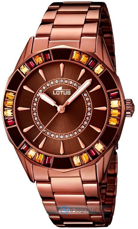 Model L15894-3 marki Lotus to gustowny zegarek naręczny damski, który jest wyposażony w pomysłowe rozwiązania oraz funkcje. Atrakcyjny wygląd zegarka osiągnięto również dzięki tarczy w kolorze brązowym. Aktualna godzina zaprezentowana jest w sposób analogowy co intuicyjnie pozwala ją odczytać. Koperta szeroka jest na 37 mm - charakteryzuje się okrągłym kształtem.