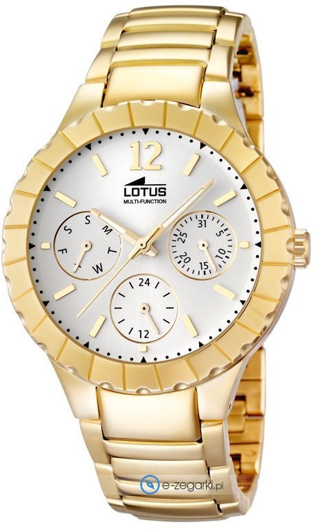 Model L15903-1 marki Lotus to gustowny zegarek naręczny damski, który wyposażono w ciekawe rozwiązania i funkcje. Styl zapewnia wysokiej jakości cyferblat w kolorze złotym. Zaprezentowana metodą analogową aktualna godzina jest czytelna i prosta do odczytania. Koperta szeroka jest na 36 mm - posiada okrągły kształt.