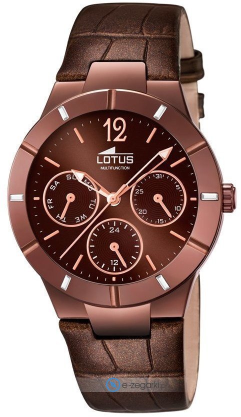 Model L15918-2 marki Lotus to elegancki zegarek naręczny damski, który posiada pomysłowe rozwiązania oraz funkcje. Niebanalny wygląd czasomierza uzyskano poprzez tarczę w kolorze brązowym.