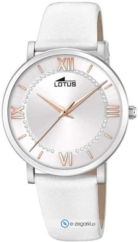 Zegarek damski L18701-5 marki Lotus to ciekawa pozycja dla ludzi ceniących sobie dbałość o szczegóły a także bezawaryjne zachowanie mechanizmów. Wysokiej jakości cyferblat zegarka ozdobiono białym kolorem. Pokazana metodą analogową aktualna godzina jest czytelna i łatwa do odczytania. Koperta szeroka jest na 38 mm - charakteryzuje się okrągłym kształtem.