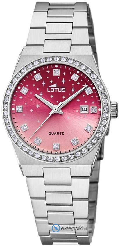 Model L18885-2 marki Lotus to elegancki zegarek naręczny damski, który wyposażono w ciekawe rozwiązania i funkcje. Charakterystyczny wygląd czasomierza osiągnięto także dzięki tarczy w kolorze różowym. Zegarek ten prezentuje godzinę w formacie analogowym dzięki temu odczyt jest bardzo łatwy. Koperta szeroka jest na 32 mm - w kształcie okrągłym.