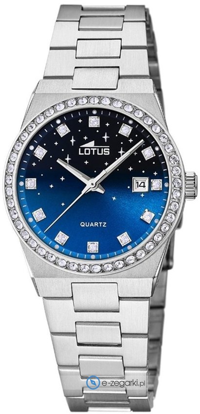Damski zegarek Lotus L18885-3 to zegarek, który dzięki swemu wzornictwu zawsze będzie prezentował się dobrze. Wysokiej jakości tarczę zegarka pokryto niebieskim kolorem. Pokazana metodą analogową aktualna godzina jest czytelna i prosta do odczytania. Koperta szeroka jest na 32 mm - posiada okrągły kształt.
