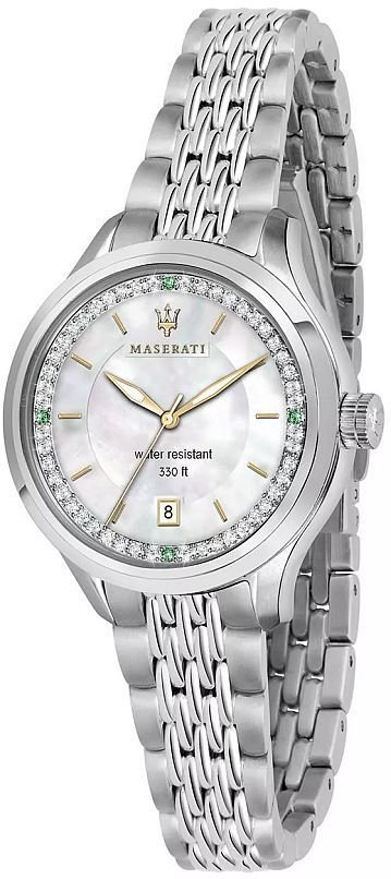Zegarek damski R8853112513 marki Maserati to dobra propozycja dla osób ceniących sobie dbałość o detale oraz bezawaryjne działanie mechanizmów. Wysokiej jakości cyferblat zegarka pokryto białym kolorem. Aktualna godzina przedstawiona jest w sposób analogowy co intuicyjnie pozwala ją odczytać. Koperta została pokryta kolorem srebrnym szeroka jest na 32 mm oraz ma grubość 9 mm - charakteryzuje się okrągłym kształtem.