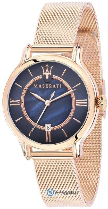Model R8853118513 marki Maserati to gustowny zegarek naręczny damski, który wyposażono w pomysłowe rozwiązania i funkcje. Tarcza zegarka jest w kolorze niebieskim. Zegarek ten prezentuje aktualny czas w formacie analogowym dzięki temu odczyt jest bardzo łatwy. Koperta jest pokryta kolorem różowo złotym szeroka jest na 34 mm oraz ma grubość 9 mm - wyróżnia się okrągłym kształtem.