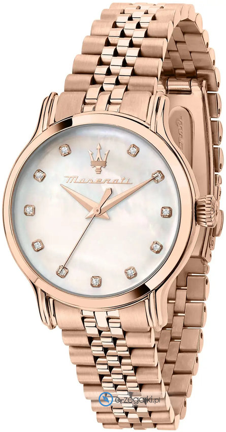 Model R8853118517 marki Maserati to elegancki zegarek naręczny damski, który posiada ciekawe rozwiązania i funkcje. Charakterystyczną konstrukcję zegarka osiągnięto dzięki tarczy w kolorze perłowym. Pokazana metodą analogową aktualna godzina jest czytelna i łatwa do odczytania. Koperta jest w kolorze różowo złotym szeroka jest na 34 mm oraz ma grubość 8.5 mm - posiada okrągły kształt.