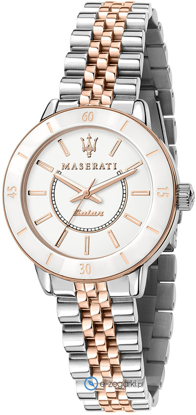 Zegarek damski R8853145504 marki Maserati to stylowe połączenie funkcjonalności oraz ciekawego designu. Nieschematyczny wygląd zegarka osiągnięto także dzięki tarczy w kolorze białym. Zaprezentowana metodą analogową aktualna godzina jest czytelna i szybka do sprawdzenia. Koperta w barwach koloru białego szeroka jest na 32 mm oraz ma grubość 9 mm - ma okrągły kształt.