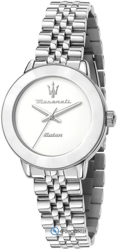 Model R8853145512 marki Maserati to gustowny zegarek naręczny damski, który posiada ciekawe rozwiązania i funkcje. Wysokiej jakości tarczę zegarka ozdobiono srebrnym kolorem. Zaprezentowana metodą analogową bieżąca godzina jest czytelna i szybka do odczytania. Koperta w odcieniach koloru srebrnego szeroka jest na 32 mm oraz ma grubość 9 mm - ma okrągły kształt.