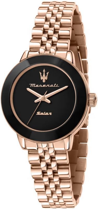 Model R8853145513 marki Maserati to elegancki zegarek naręczny damski, który posiada ciekawe rozwiązania i funkcje. Cyferblat zegarka jest w kolorze czarnym. Zegarek ten pokazuje godzinę w formacie analogowym dzięki temu odczyt jest bezproblemowy. Koperta jest w kolorze różowo złotym szeroka jest na 32 mm oraz ma grubość 9 mm - posiada okrągły kształt.