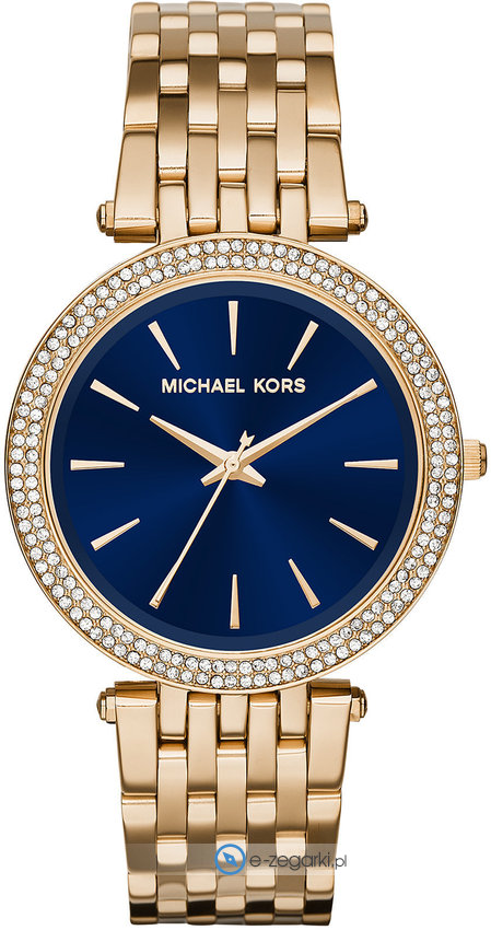 Damski zegarek Michael Kors MK3406 to zegarek, który dzięki swemu wzornictwu zawsze będzie prezentował się dobrze. Niebanalną budowę czasomierza osiągnięto z pomocą tarczy w kolorze niebieskim. Zegarek ten prezentuje aktualny czas w formacie analogowym dzięki czemu odczyt jest bezproblemowy. Koperta w barwach koloru złotego szeroka jest na 39 mm oraz ma grubość 7 mm - wyróżnia się okrągłym kształtem.