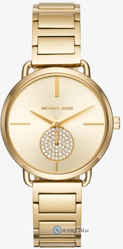 Model MK3639 marki Michael Kors to gustowny zegarek naręczny damski, który jest wyposażony w ciekawe rozwiązania i funkcje. Nieschematyczny wygląd czasomierza osiągnięto również dzięki tarczy w kolorze złotym. Aktualna godzina zaprezentowana jest w sposób analogowy co niezmiernie łatwo pozwala ją odczytać. Koperta jest w kolorze złotym szeroka jest na 37 mm oraz ma grubość 9 mm - ma okrągły kształt.